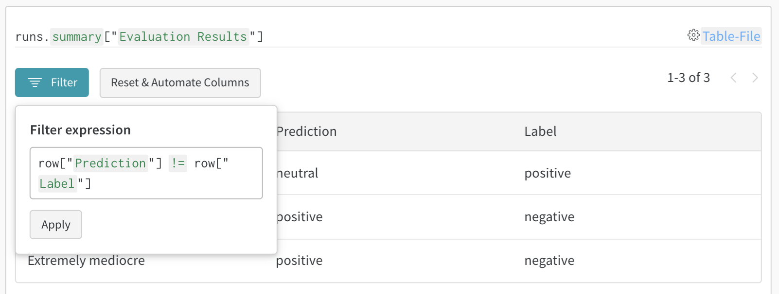 テーブルフィルター、ソート、グループ化機能を使用して、モデルの結果を探索および評価します。